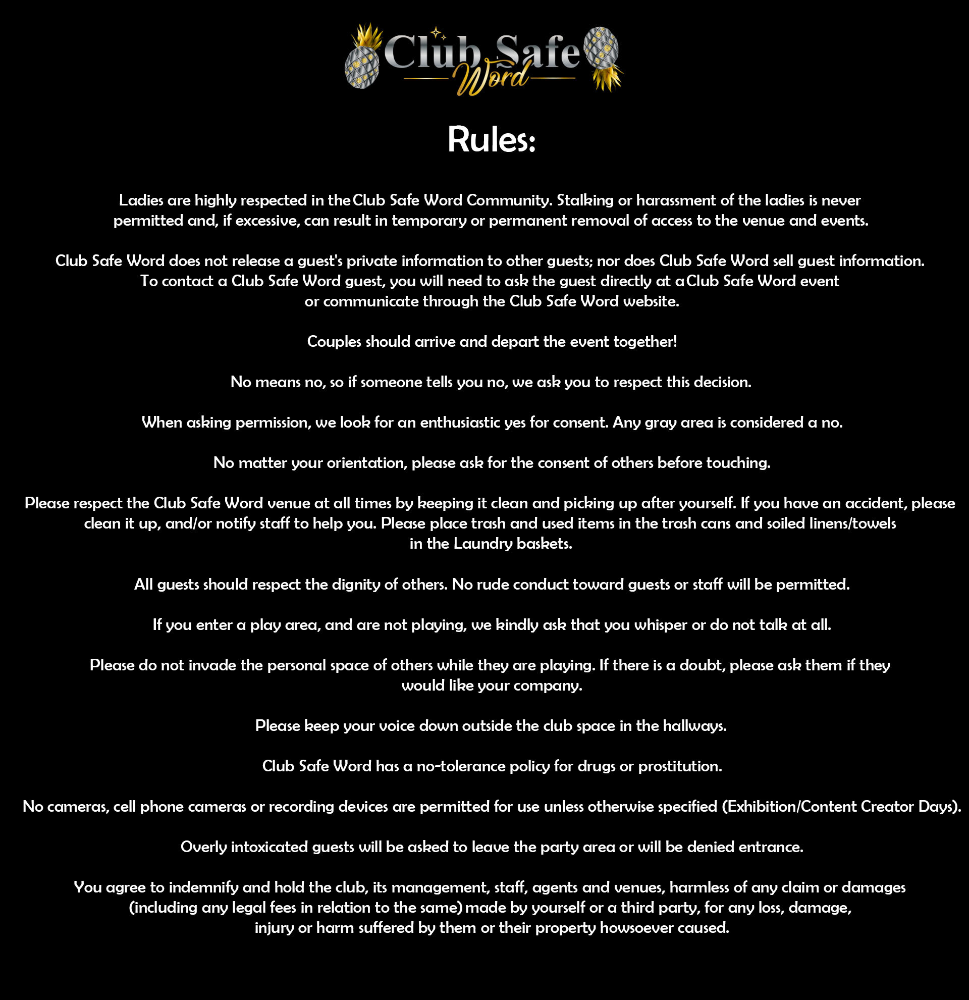 Any violation of the above rules or event rules are grounds for removal from any event and potentially the club as a whole. If you have any issues or questions with this process, please reach out to us via email at info@clubsafeword.com